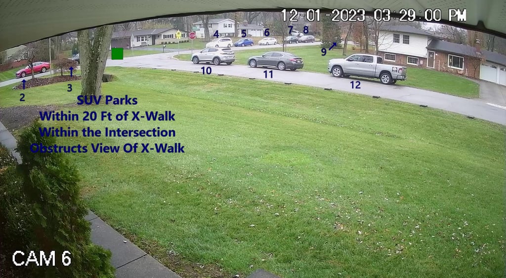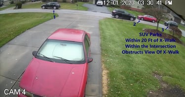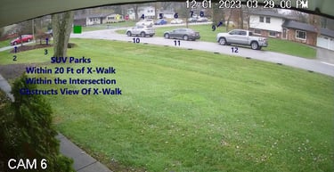 Vehicle 3 is parked within the intersection and within 20 Ft of the X-Walk.
