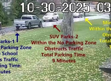 SUV 3- Parks on Cameron, within the No Parking Zone, obstructs Traffic - Total Parking Time was 9 minutes.