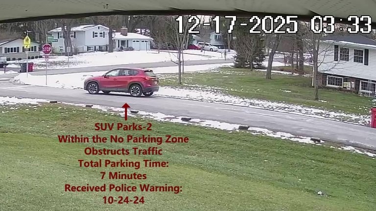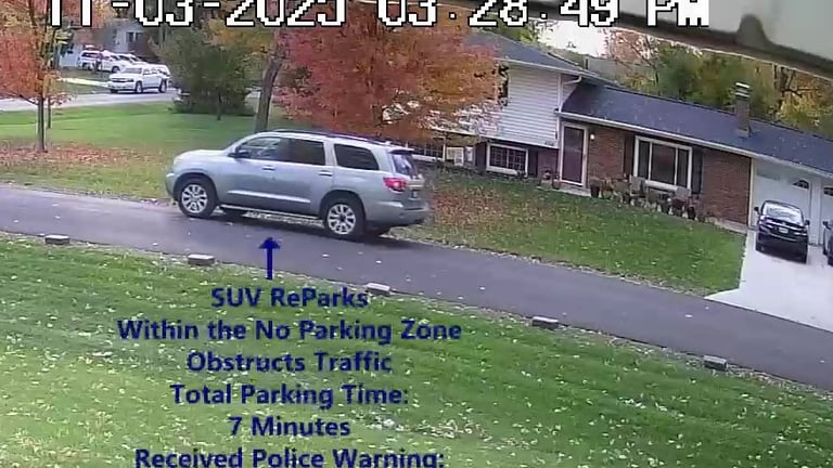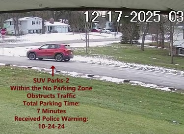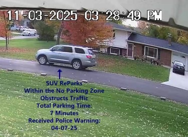 SUV 4 - Parks on Cameron, within the No Parking Zone, obstructs Traffic - Total Parking Time was 3 minutes.