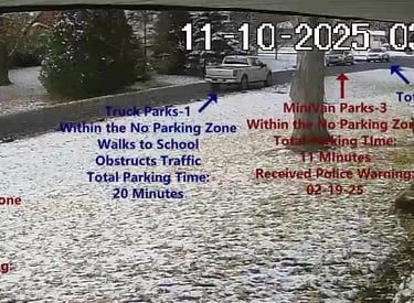 Truck 1 - Parks on Cameron, within the No Parking Zone, walks over to the School, obstructs Traffic - Total Parking Time was 20 minutes