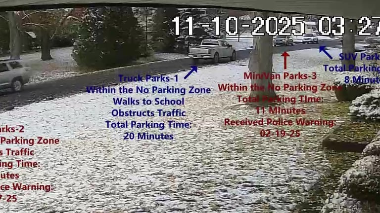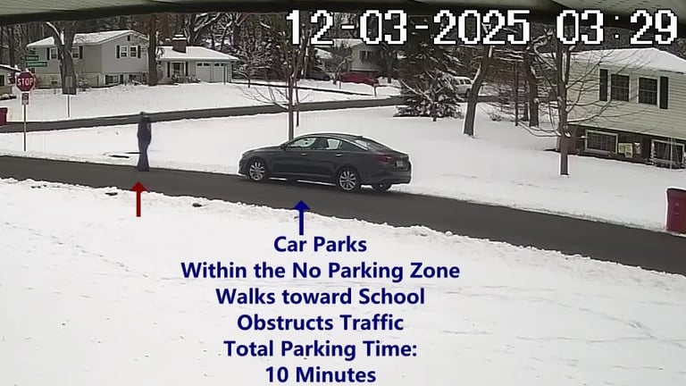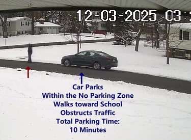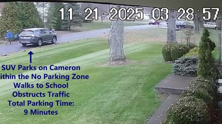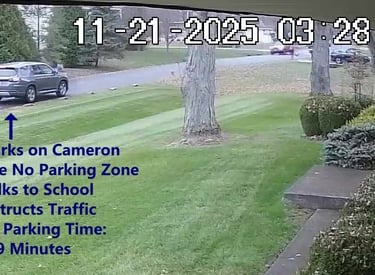 Car 2 - Parks on Cameron, Blocks Driveway, walks over to the school, obstructs Traffic - Total Parking Time was 3 minutes.