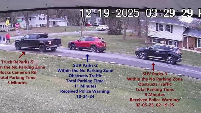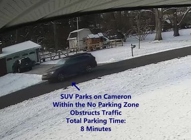SUV 2 - Parks on Cameron, within the No Parking Zone, obstructs Traffic - Total Parking Time was 3 minutes.