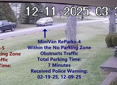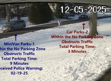 MiniVan 3 - Parks on Cameron, within the No Parking Zone, obstructs Traffic - Total Parking Time was 3 minutes.