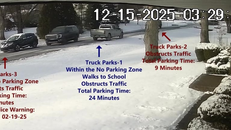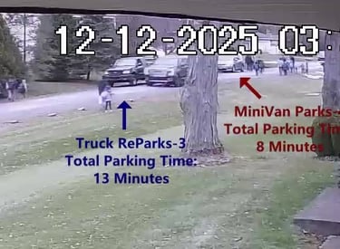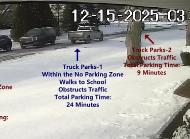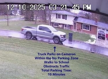 Truck 2 - Parks on Cameron, within the No Parking Zone, walks over to School, obstructs Traffic - Total Parking Time was 12 minutes.