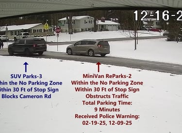MiniVan 2 - Parks on Cameron, within the No Parking Zone, obstructs Traffic - Total Parking Time was 9 minutes.