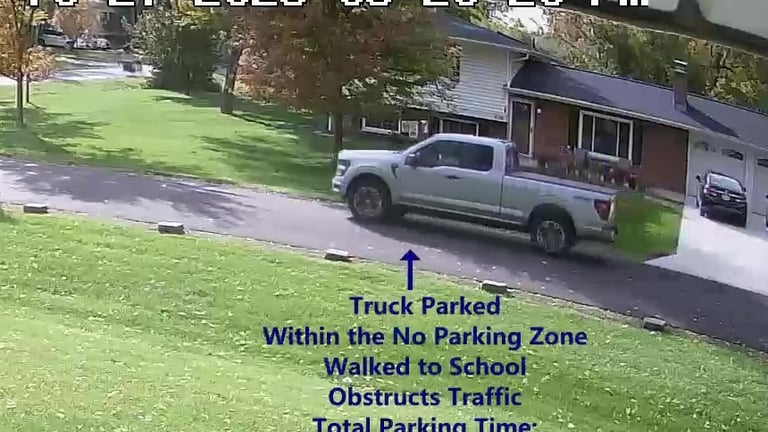Truck 1 - Parks on Cameron, within the No Parking Zone, walks over to School, obstructs Traffic - Total Parking Time was 9 minutes