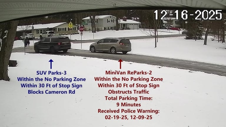 SUV - Parks on Cameron, within 30 Ft of Stop Sign, within the No Parking Zone, obstructs Traffic.