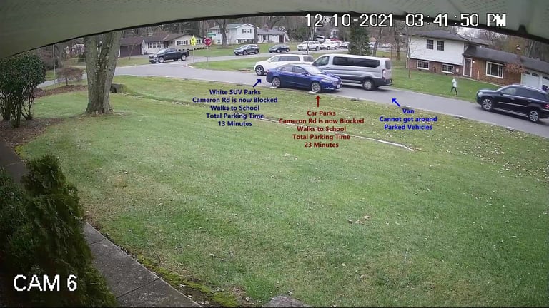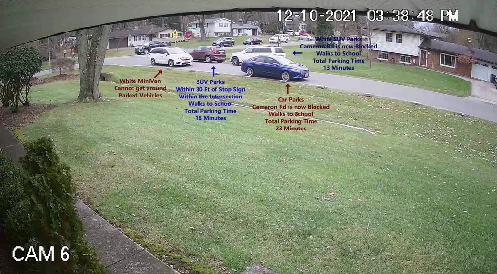 Red Car - Parks on Cameron (east side) behind the White SUV, walks over to the school, obstructs Traffic - Total Parking Time was 9 minutes.
