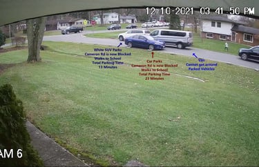 Blue Car - Parks on Cameron, walks over to the school, obstructs Traffic - Total Parking Time was 25 minutes.