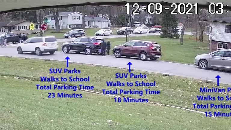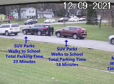 White SUV - Parks on Cameron Rd, blocking the road, walks over to the school - Total Parking Time was 13 minutes.