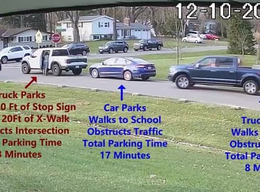 Blue Car - Parks on Cameron, walks over to the school, obstructs Traffic - Total Parking Time was 18 minutes.