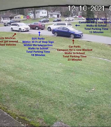 White SUV - Parks on Cameron, within 30 ft of Stop Sign, walks over to the school, obstructs Traffic - Total Parking Time was 11 minutes.