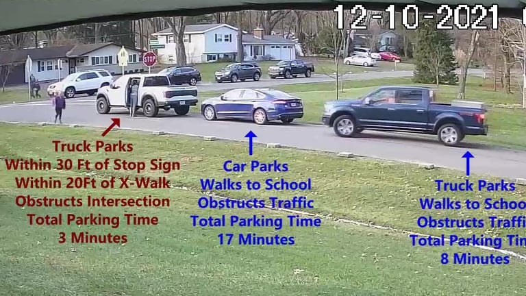 White SUV - Parks on Cameron, walks over to the school, obstructs Traffic - Total Parking Time was 7 minutes.
