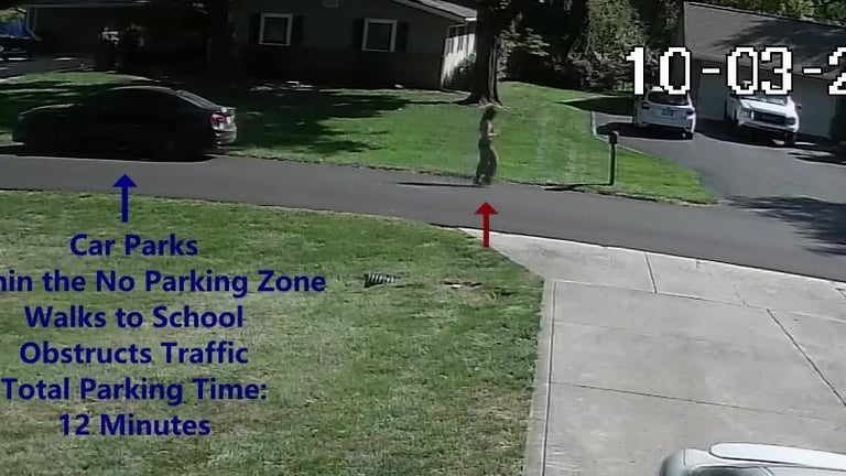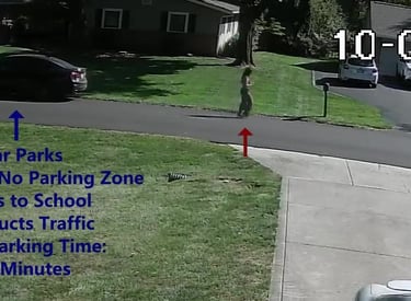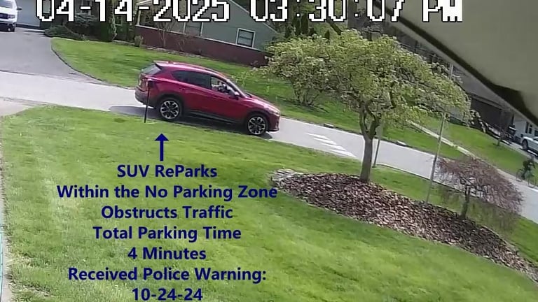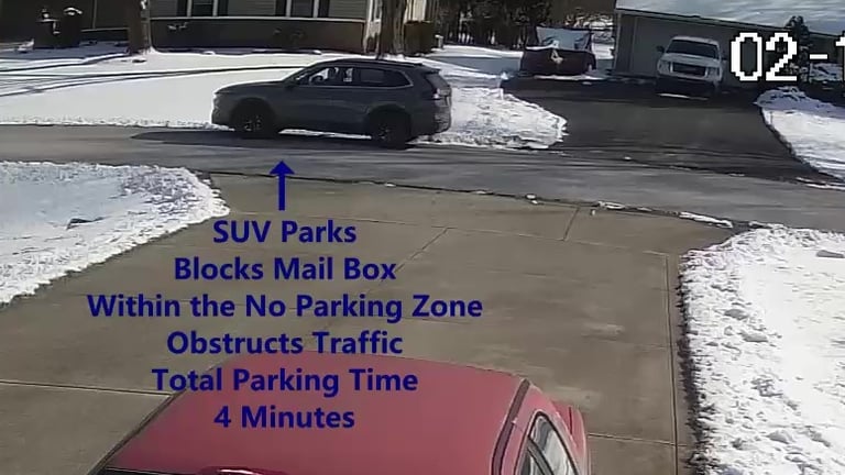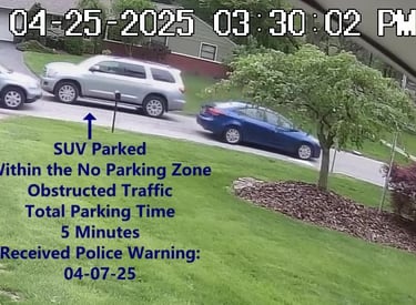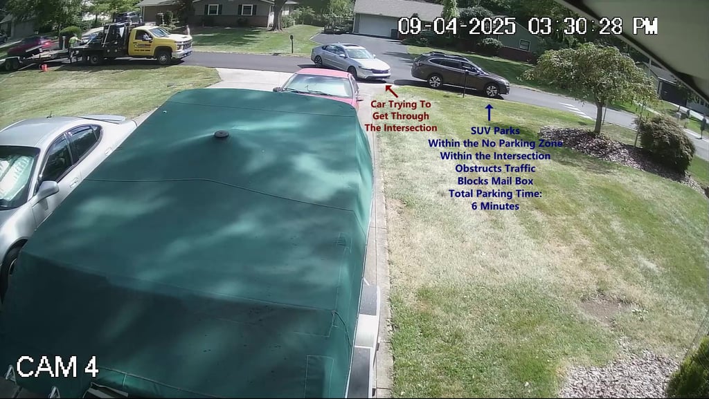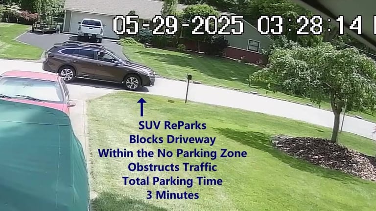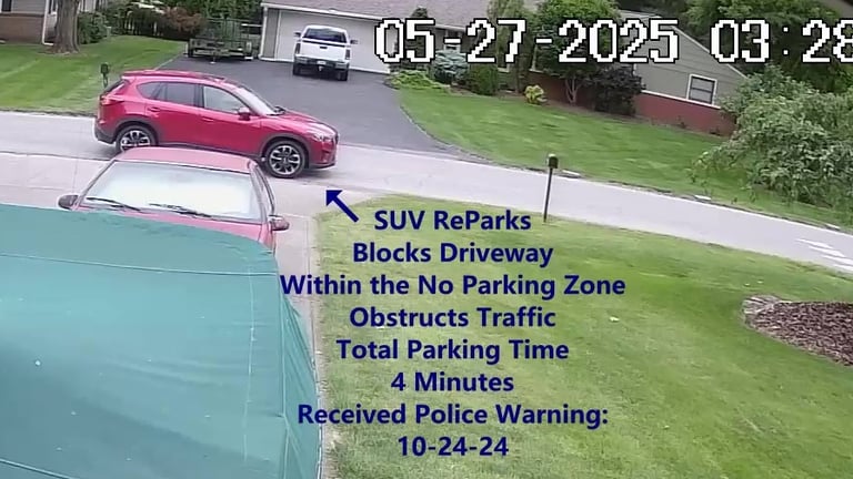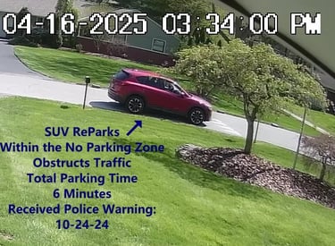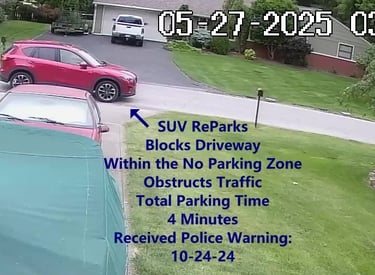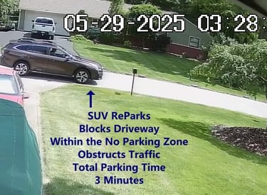 SUV - Parks blocking the Driveway at 4300 Cameron Rd, within the No Parking Zone, obstructs Traffic.