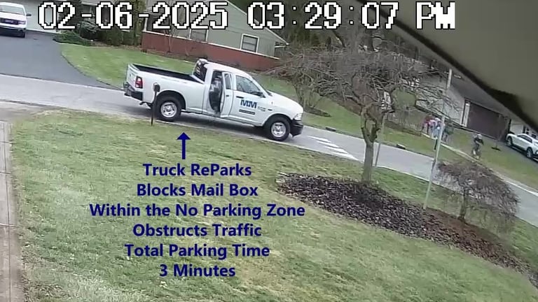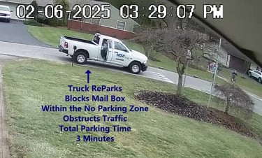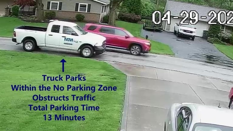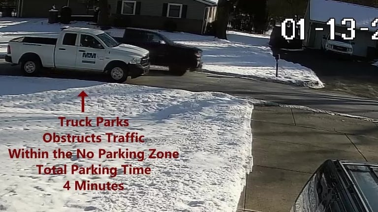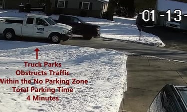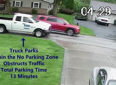 Truck 2 - Parks on Darbyshire, within the No Parking Zone, obstructs Traffic - Total Parking Time was 2 minutes.
