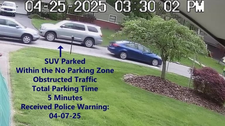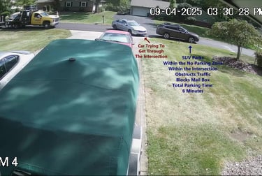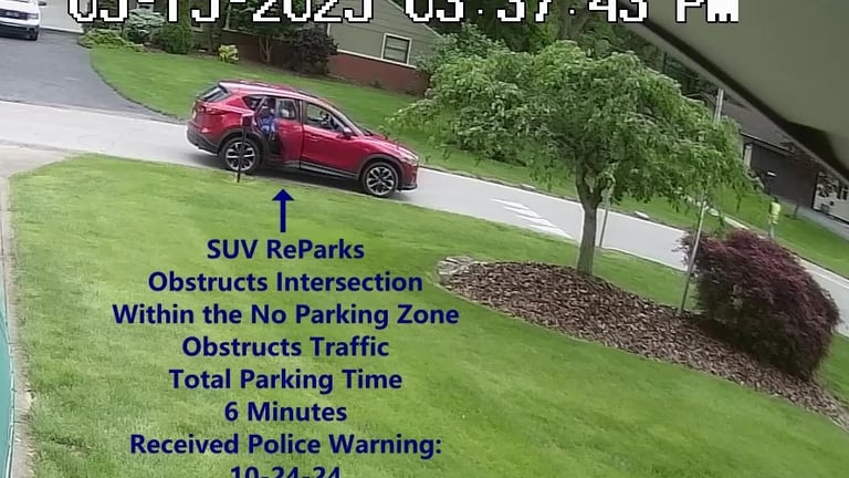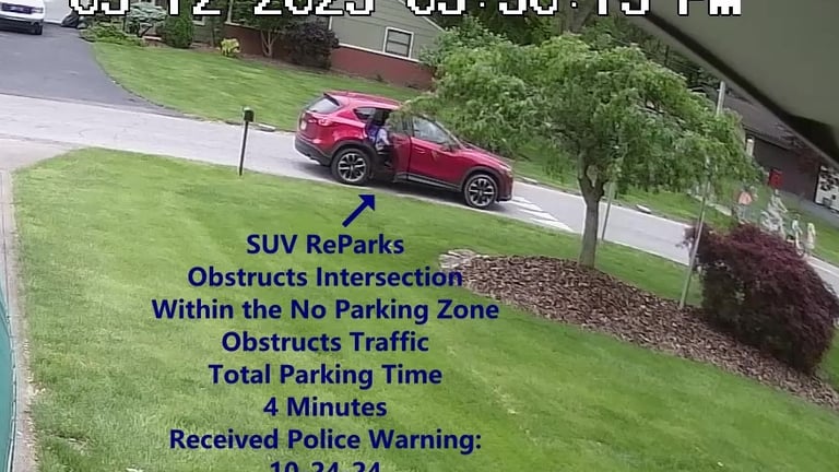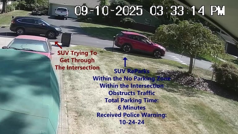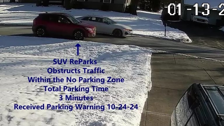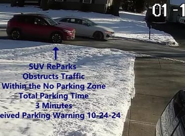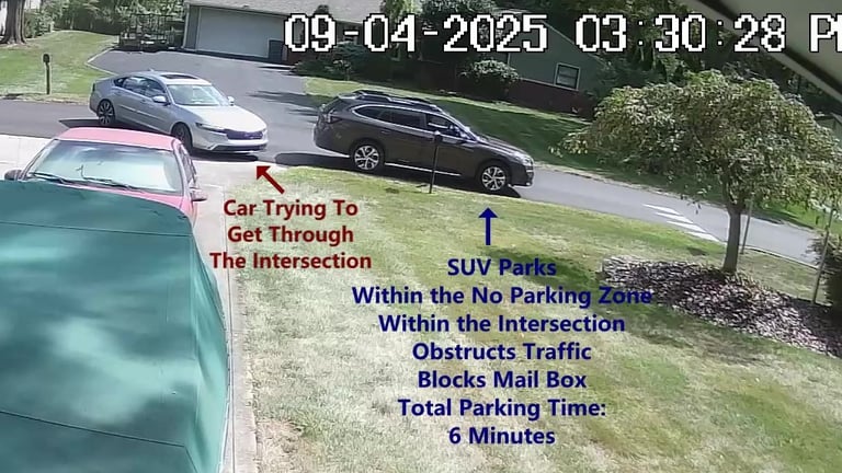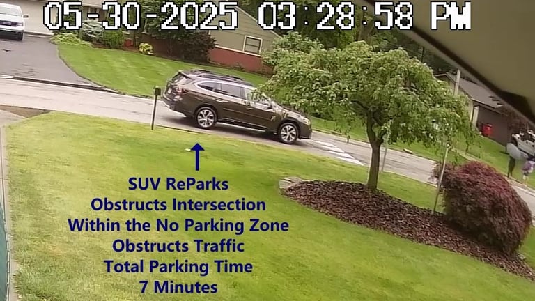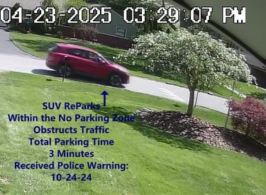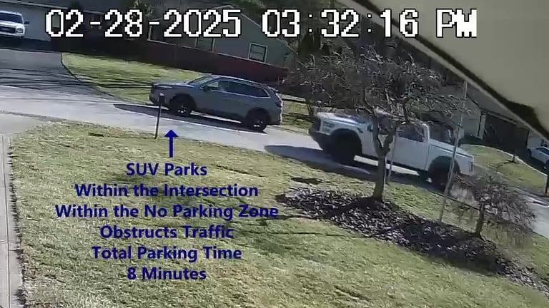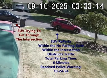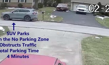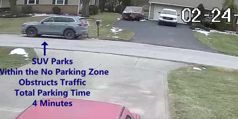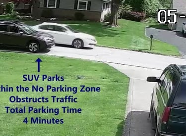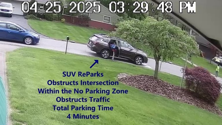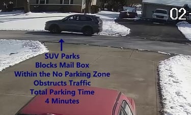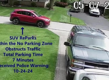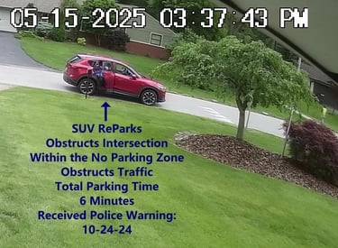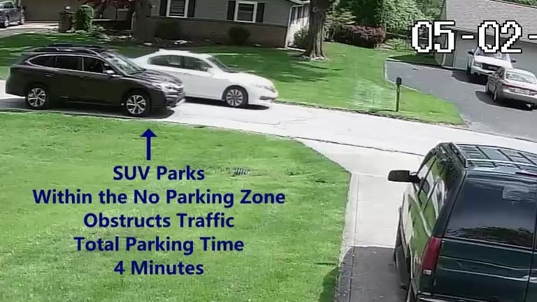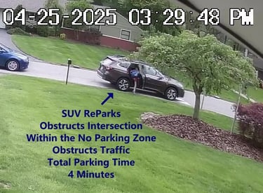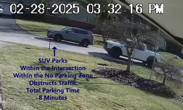 SUV 1 - Parks on Darbyshire, within the Intersection, within the No Parking Zone, obstructs Traffic - Total Parking Time was 8 minutes.