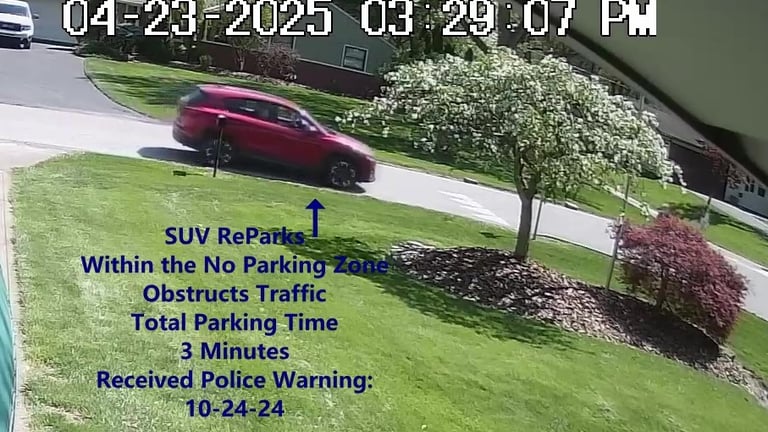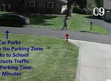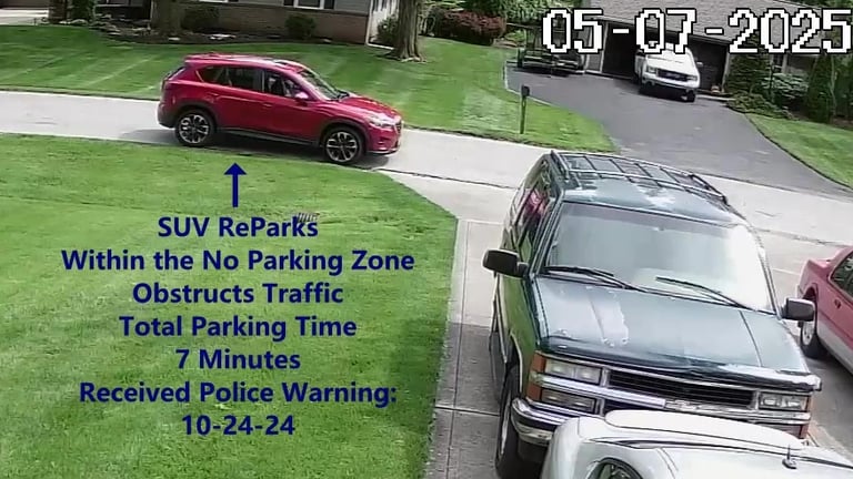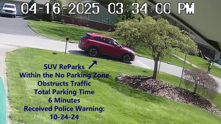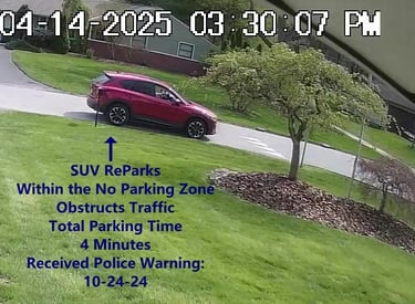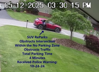 SUV - Parks on Darbyshire Dr, within the No Parking Zone, obstructs Traffic.