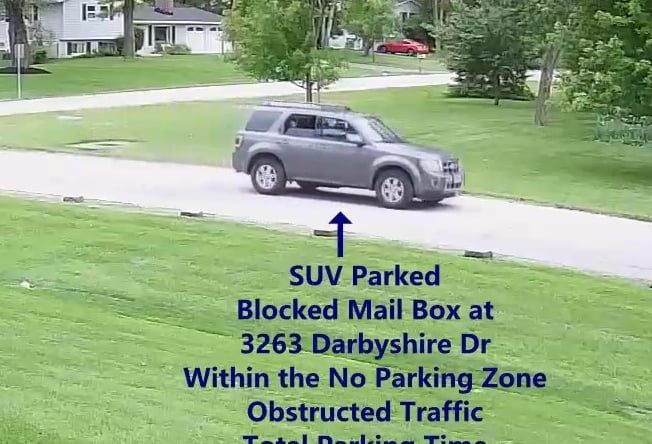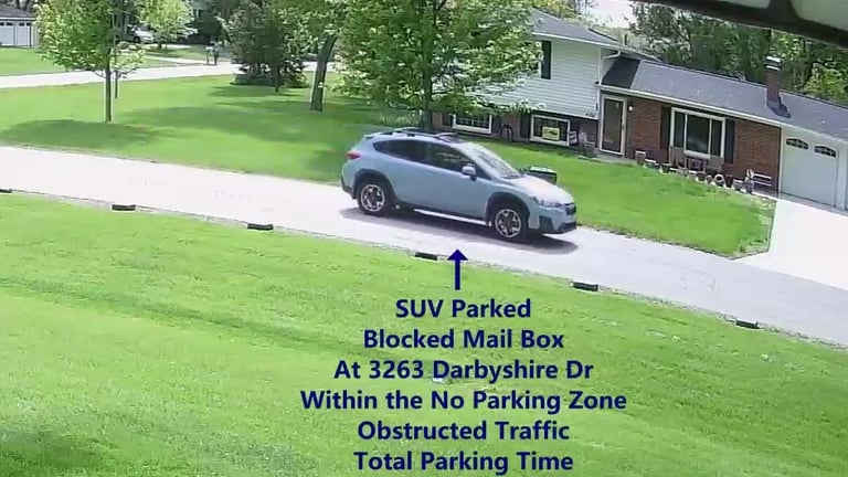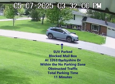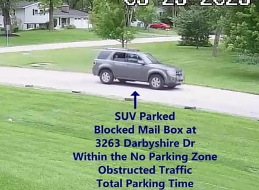 SUV - Parks blocking the Mail Box at 3263 Darbyshire Dr, within the No Parking Zone, obstructs Traffic.