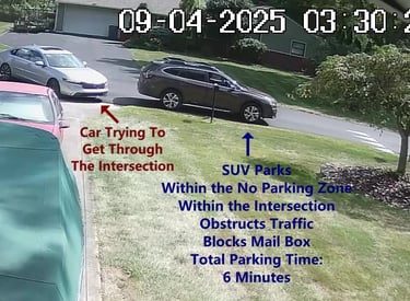 SUV - Parks on Darbyshire Dr, within the No Parking Zone, obstructs Intersection, obstructs Traffic.