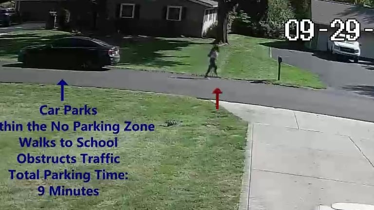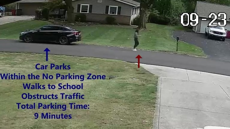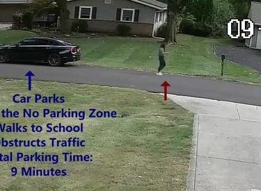 Car - Parks on Darbyshire Dr, within the No Parking Zone, walks over to the School, obstructs Traffic.