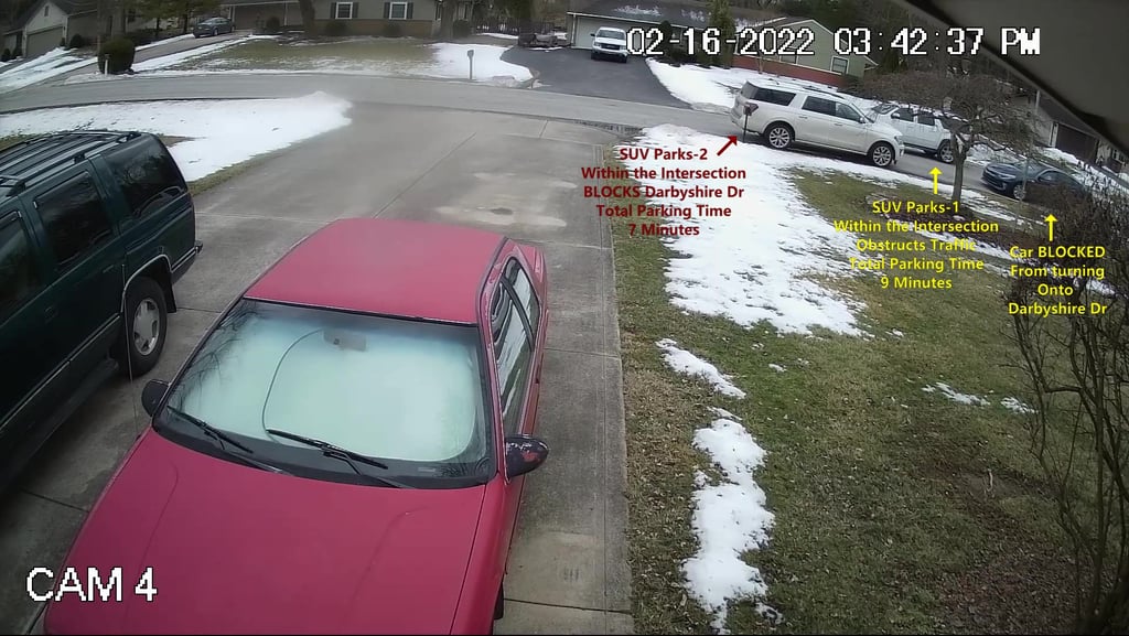 Notice - Car BLOCKED from turning onto Darbyshire Dr by the 2 Parked SUV's.