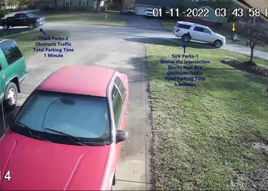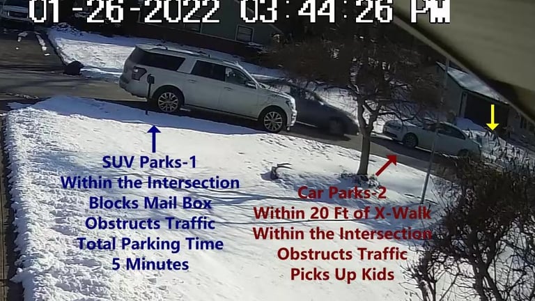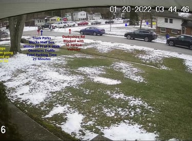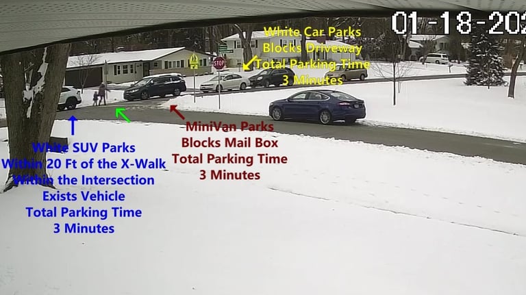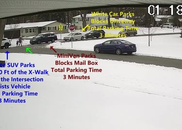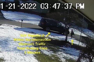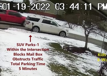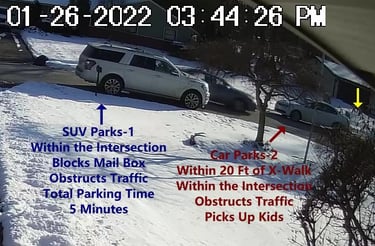 Vehicle 1 - Parks on Darbyshire, within the Intersection, Blocks Mail Box, obstructs Traffic - Total Parking Time was 8 minutes.