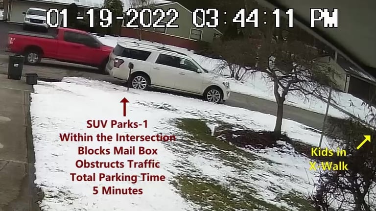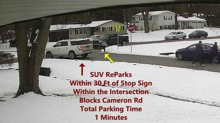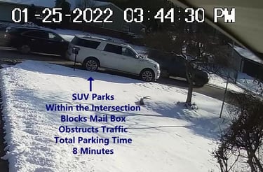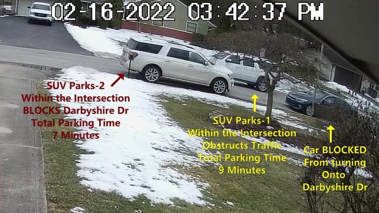 White SUV - Parks on Darbyshire, within the Intersection, Blocks Mail Box, obstructs Traffic - Total Parking Time was 5 minutes.
