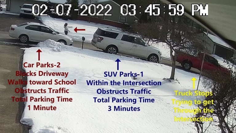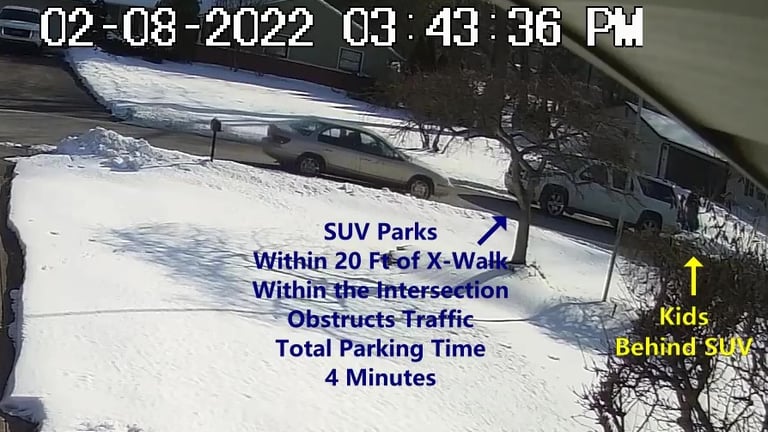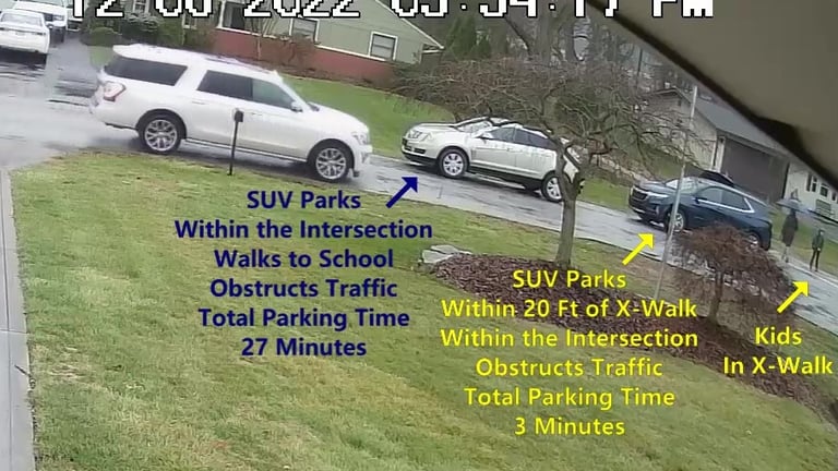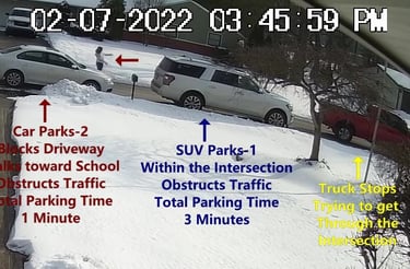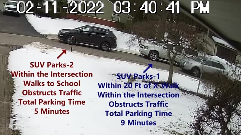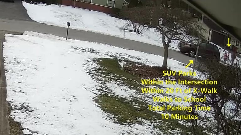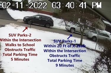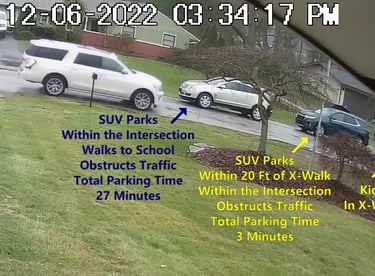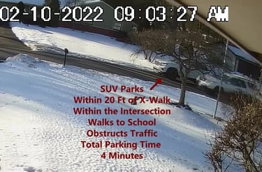 SUV 2 - Parks on Darbyshire, within the Intersection, walks over to the school, obstructs Traffic - Total Parking Time was 5 minutes.