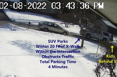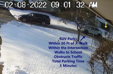 SUV parked within 20 Ft of the X-Walk is obstructing the view of the Kids in the X-Walk.