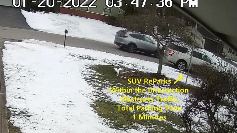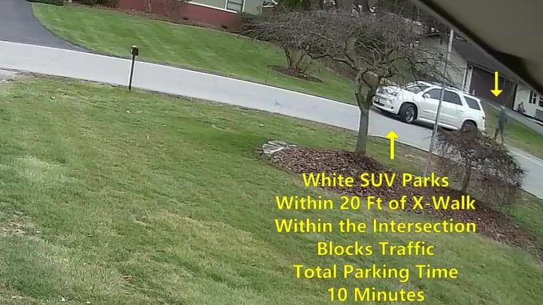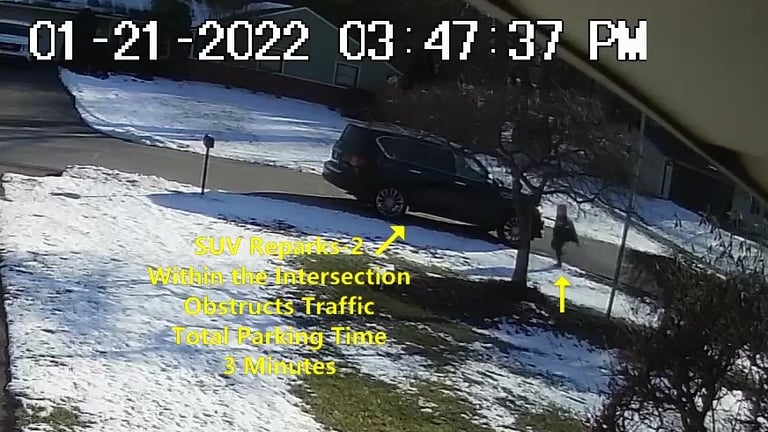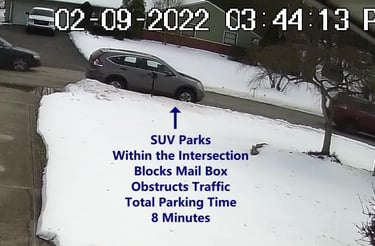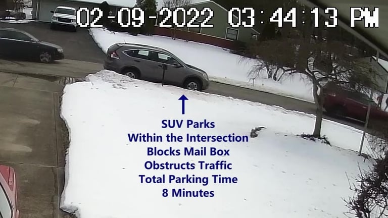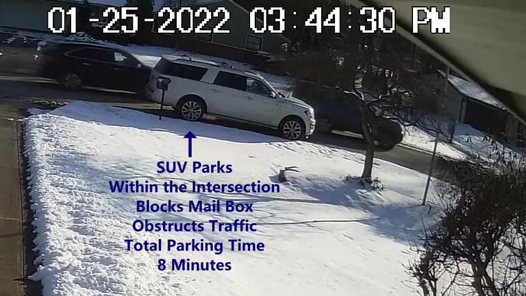 White SUV - Parks on Darbyshire, within the Intersection, Blocks Mail Box, obstructs Traffic - Total Parking Time was 8 minutes.