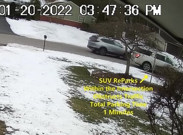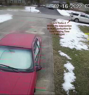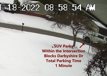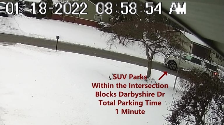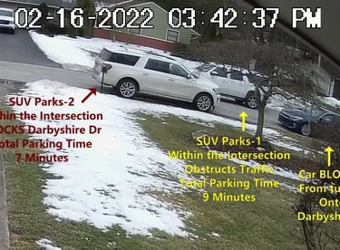 SUV 1 - Parks on Darbyshire, within the Intersection, obstructs Traffic - Total Parking Time was 9 minutes.