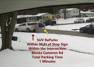 White SUV - Second Parks on Cameron Rd, within 30 Ft of Stop Sign, within the Intersection, Blocks Cameron Rd - Total Parking Time was 1 minutes.