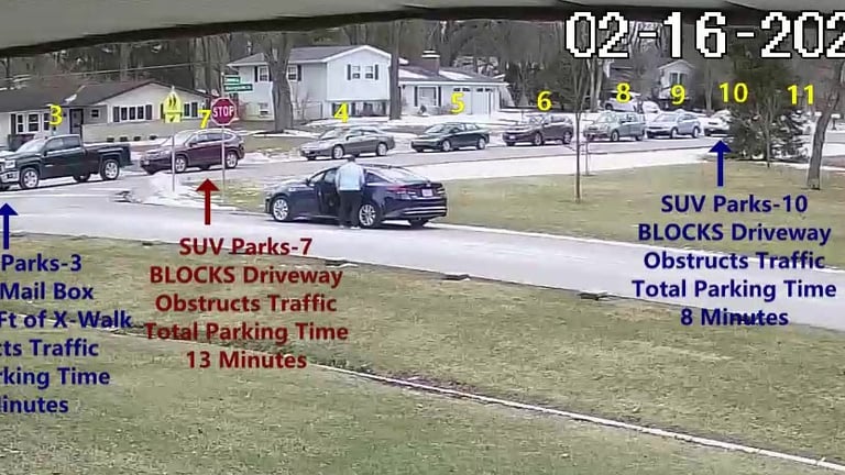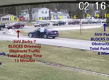 Vehicle 10 - Parks on Darbyshire, BLOCKS Driveway, obstructs Traffic - Total Parking Time was 8 minutes.