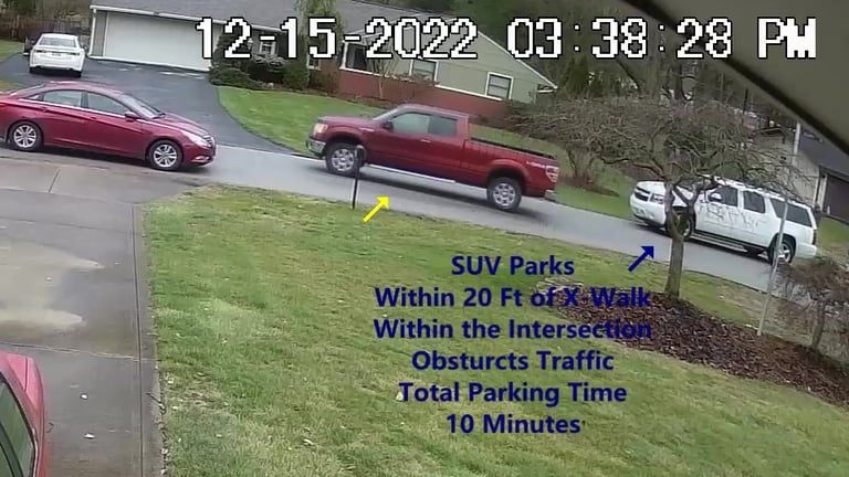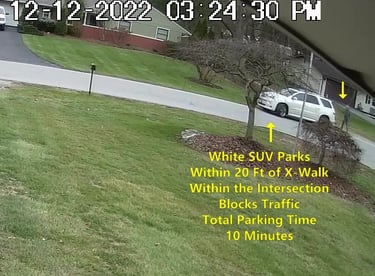 Vehicle 7 - White SUV Parks on Darbyshire, within 20 Ft of X-Walk, within the Intersection, obstructs Traffic - Total Parking Time was 10 minutes.