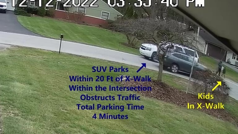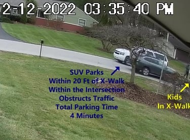 White SUV parked within 20 Ft of the X-Walk is obstructing the view of the Kids in the X-Walk.
