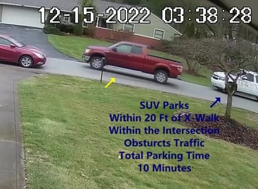 SUV 1 - Parks on Darbyshire, within 20 Ft of X-Walk, within the Intersection, obstructs Traffic - Total Parking Time was 9 minutes.