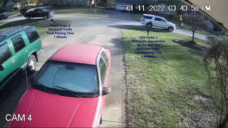 2 Vehicles - Parked and Blocking Traffic on Darbyshire Dr (Camera 4).