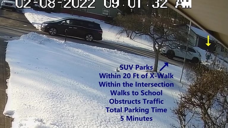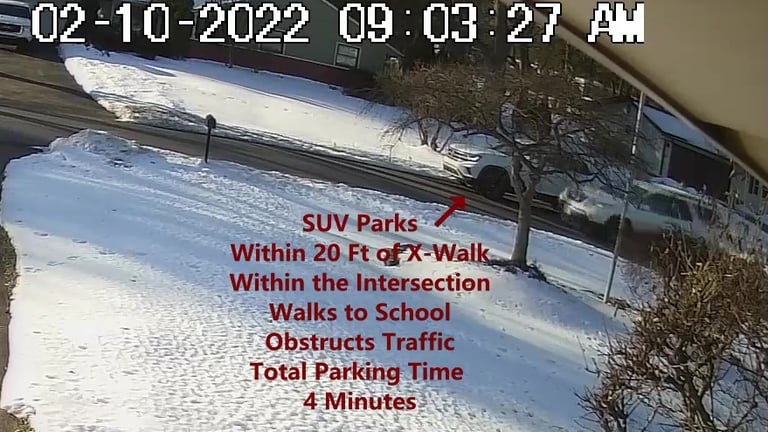 White SUV - Parks on Darbyshire, within 20 Ft of X-Walk, within the Intersection, walks over to the school, obstructs Traffic - Total Parking Time was 10 minutes.