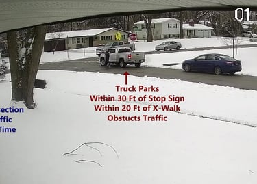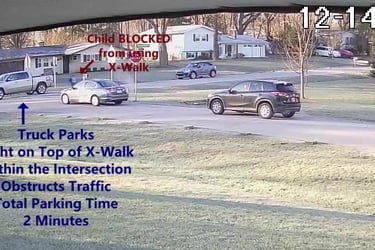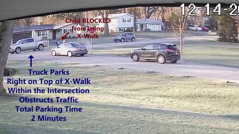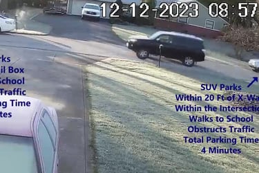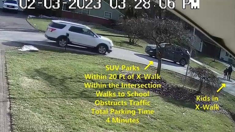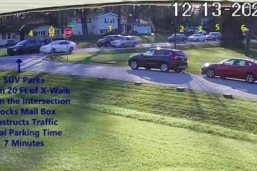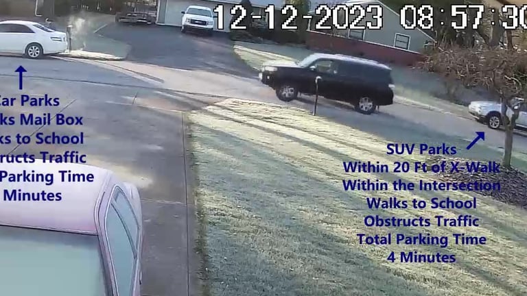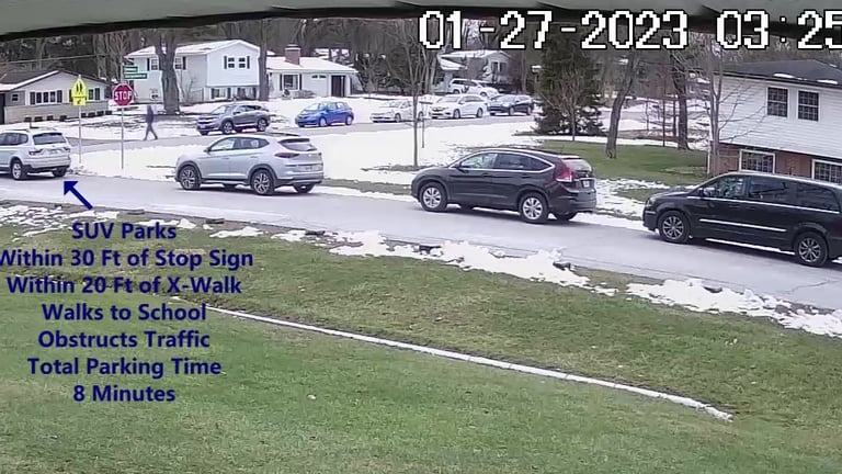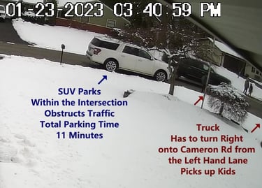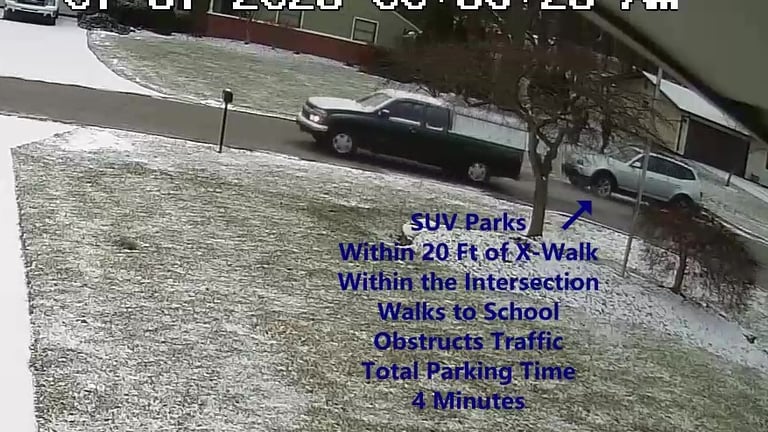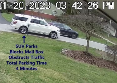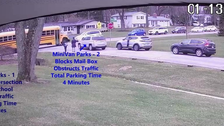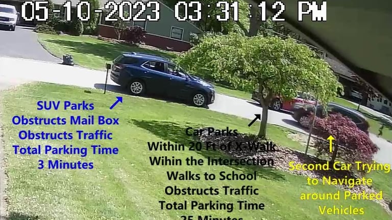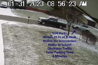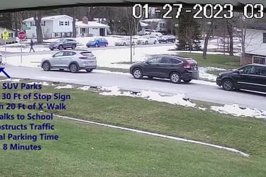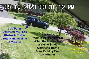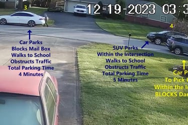 Vehicle 3 - Parks on Darbyshire, blocks Mail Box, walks over to the school, obstructs Traffic - Total Parking Time was 4 minutes.