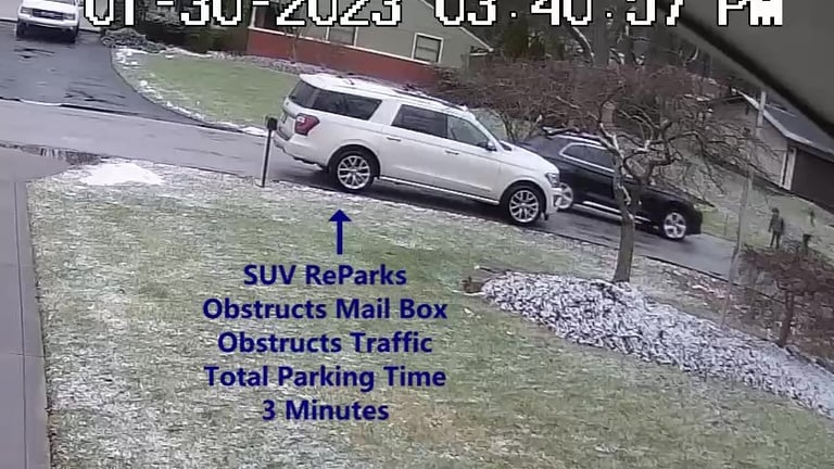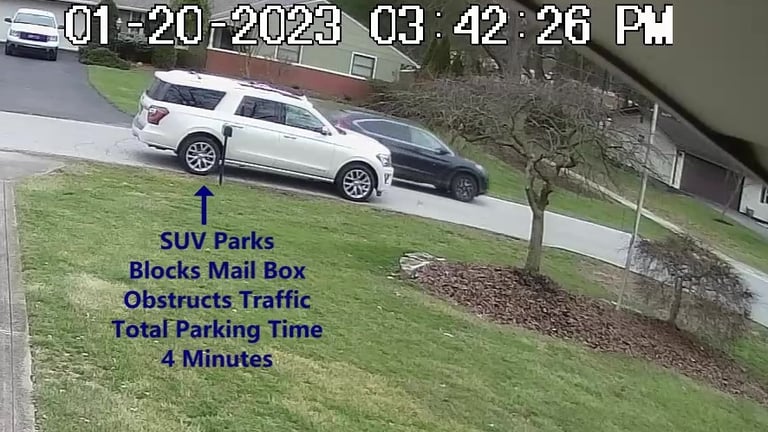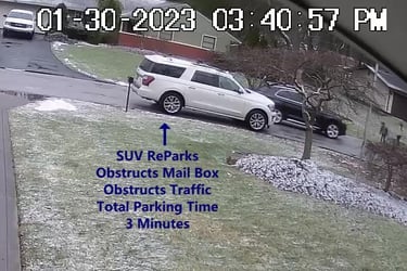 Blue SUV - Parks on Darbyshire, obstructing the Mail Box, obstructs Traffic - Total Parking Time was 3 minutes.