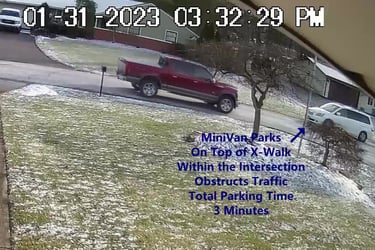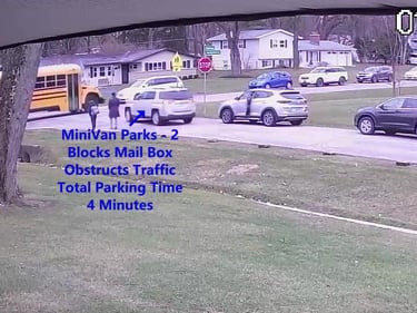 MiniVan - Parks then ReParks on Darbyshire, blocks Mail Box, obstructs Traffic - Total Parking Time was 2 minutes.