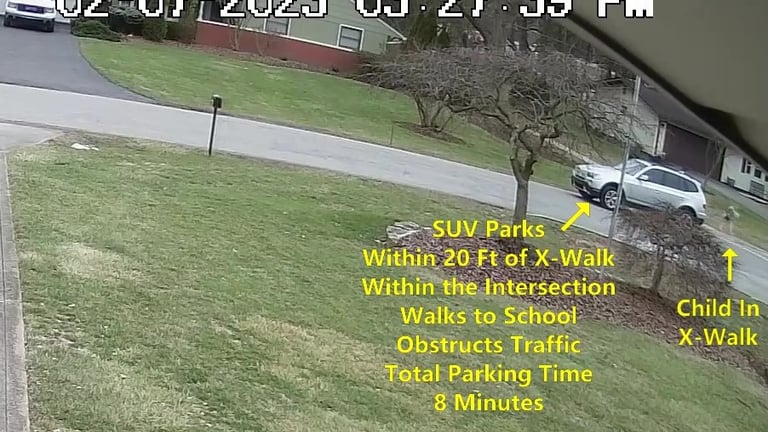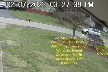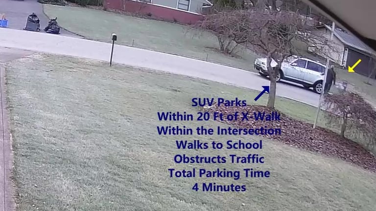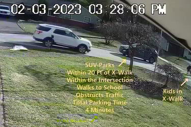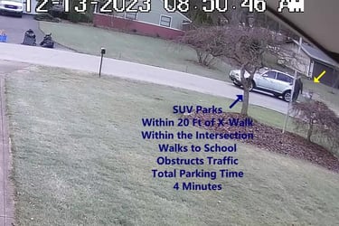SUV - Parks on Darbyshire, within 20 Ft of the X-Walk, within the Intersection, walks over to the School, obstructs Traffic - Total Parking Time was 8 minutes.