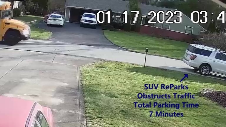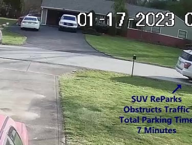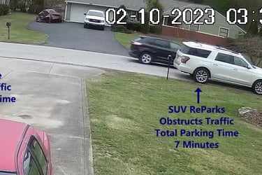 SUV - Parks then ReParks on Darbyshire, obstructs Traffic - Total Parking Time was 3 minutes.