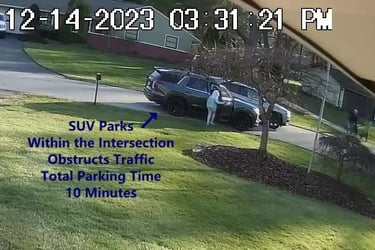 SUV - Parks on Darbyshire, within the Intersection, obstructs Traffic - Total Parking Time was 10 minutes.