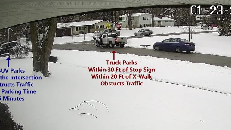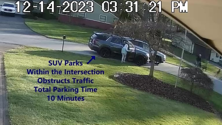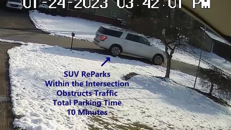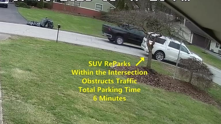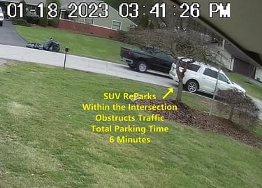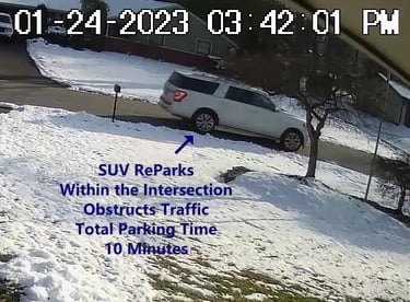 White SUV - Parks on Darbyshire, within the Intersection, obstructs Traffic - Total Parking Time was 4 minutes.