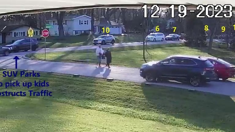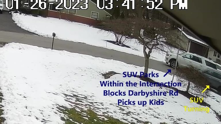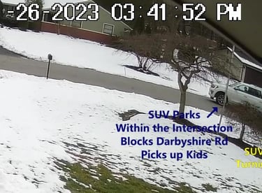 White SUV - Parks on Darbyshire Dr, to pick up kids, Blocks Darbyshire Dr.