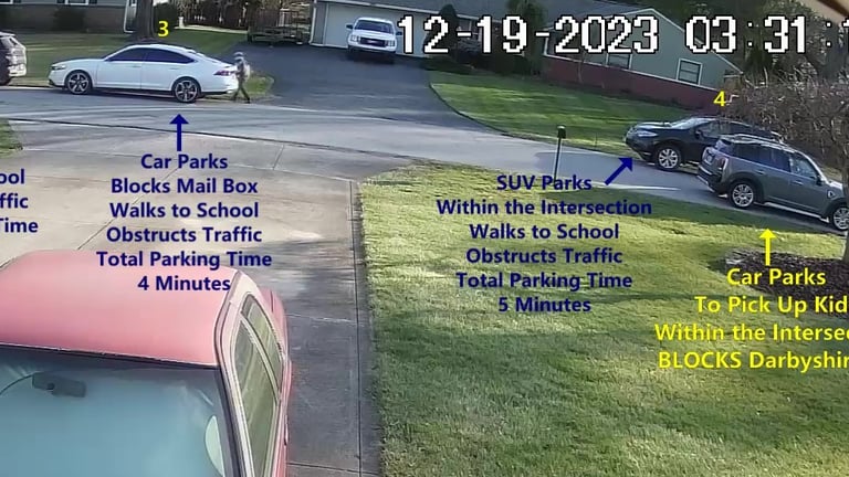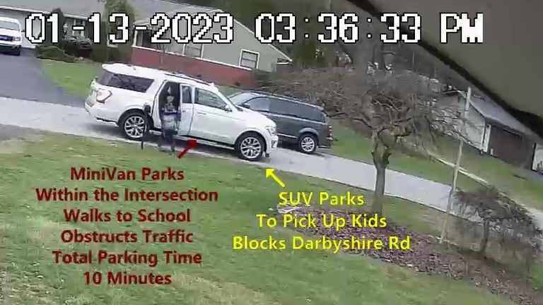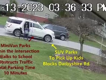Vehicle 3 - Parks on Darbyshire, blocks the Driveway at 3263 Darbyshire Dr, walks over to the school, obstructs Traffic - Total Parking Time was 20 minutes.