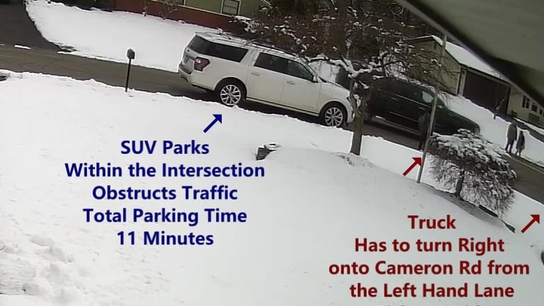 White SUV - Parks on Darbyshire, within the Intersection, blocks Darbsyhire - Total Parking Time on Cameron Rd and Darbyshire Dr was 7 minutes.