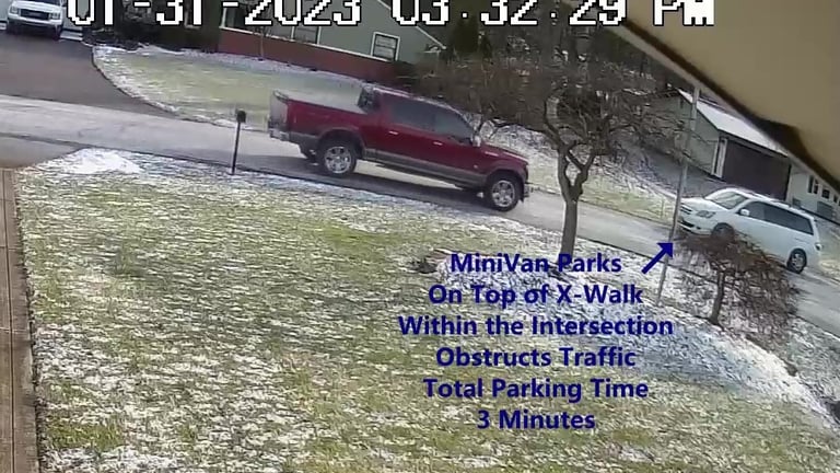 White MiniVan - Parks and blocks the Mail Box at 3255 Darbyshire Dr, obstructs traffic around the Intersection - Total Parking Time was 4 minutes.