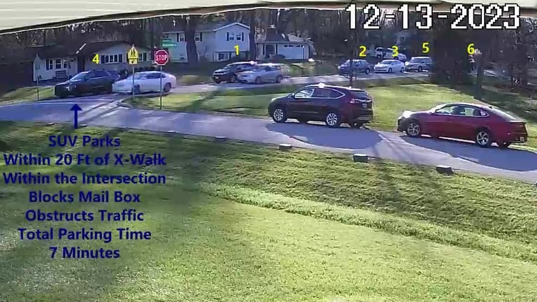 Vehicle 4 - Parks on Darbyshire, within 20 Ft of the X-Walk, within the Intersection, blocks Mail Box, obstructs Traffic - Total Parking Time was 7 minutes.